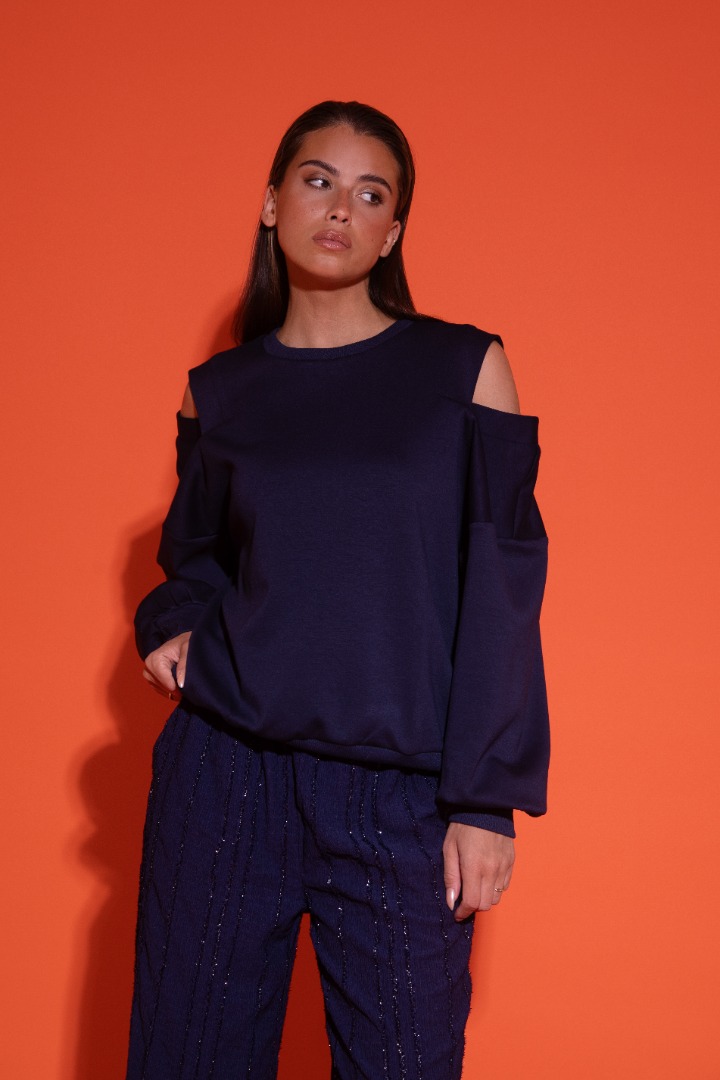 Deze Blue Philou Sweater van Studio Amaya geeft een speelse twist aan je outfit door de open shoulders.