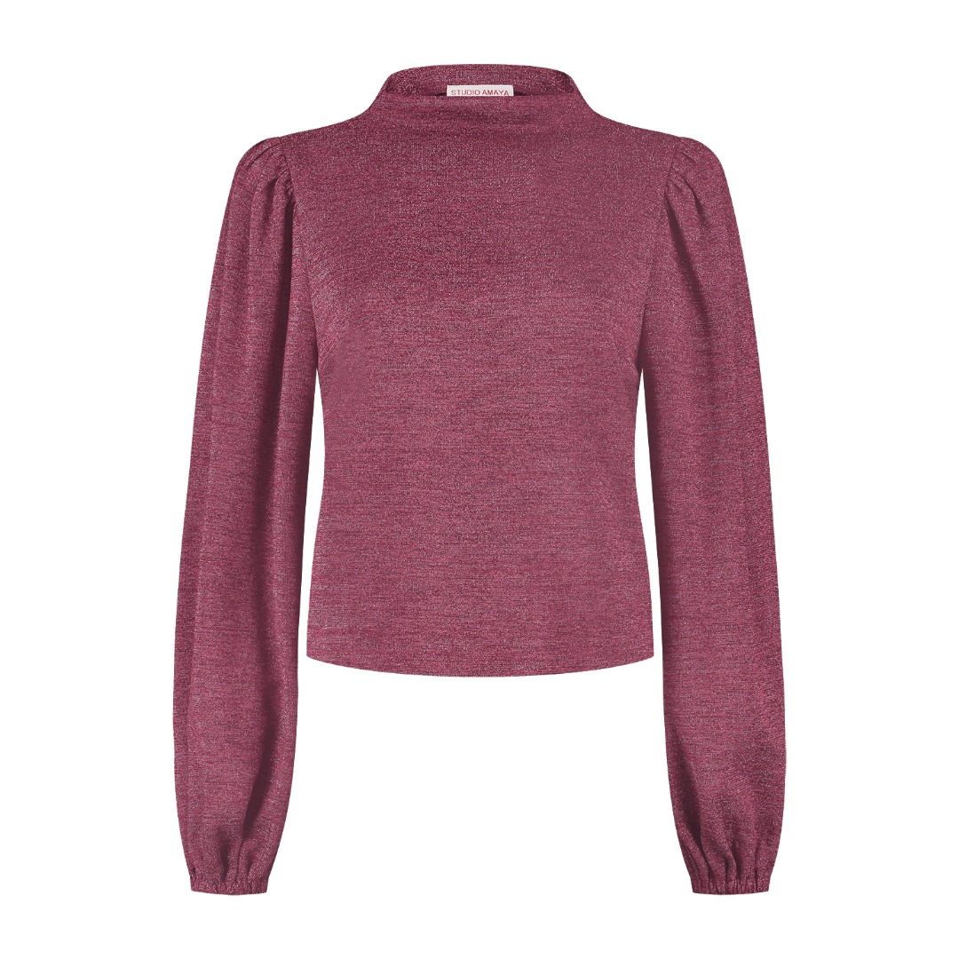 De Eden Top is gemaakt van roze kwaliteit met metallic glans. De Top heeft een hoge hals en poffende schouders. Ballon mouwen met elastische manchetten. De top valt charmant of je figuur heen en heeft een mooie taille lijn.