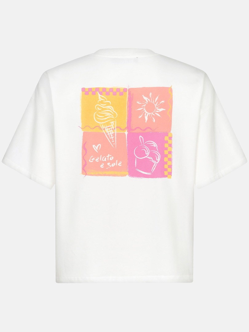Haal de zomer in huis met het Ydence T-shirt Gelato e solo. Dit stijlvolle witte shirt van het Nederlandse modemerk Ydence is de perfecte mix van een speelse print en een tijdloos design. Of je nu gaat voor een terrasje in de zon of een ontspannen stranddag, dit T-shirt geeft je outfit direct een vrolijke, zomerse touch.