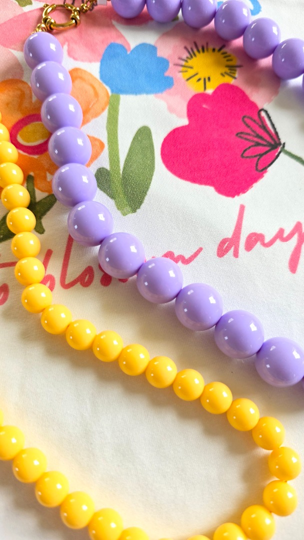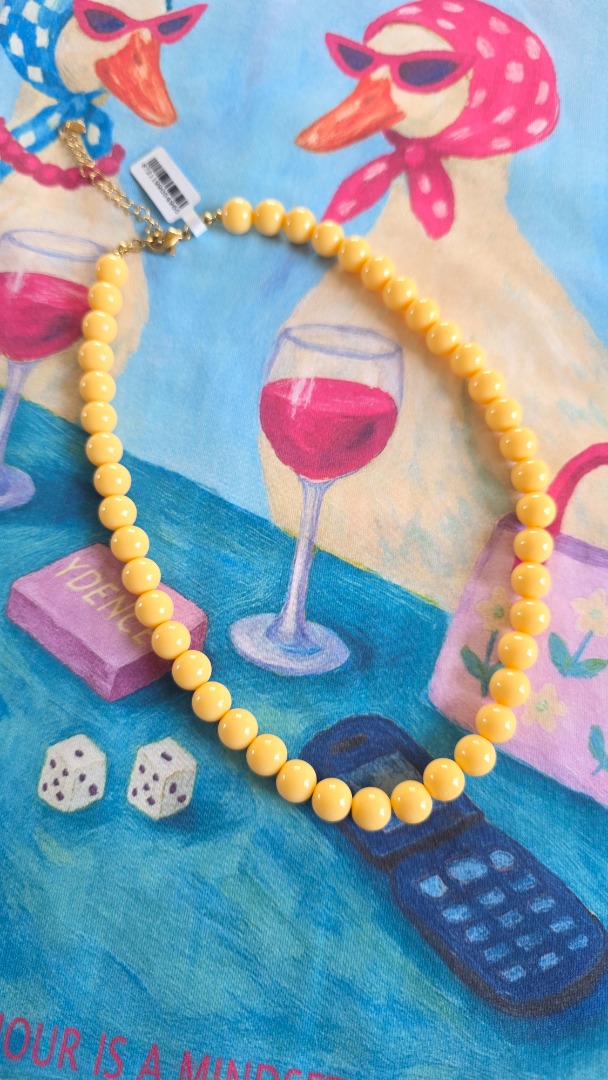 De gele kralenketting straalt warmte en vrolijkheid uit.